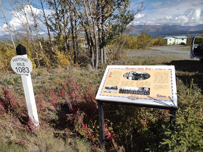 At the Alaska Highway mile post 1083 was an information sign about this area of Destruction Bay and the heroic efforts in 1942 to build the Alcan (later named Alaskan) Highway at the time of World War II: