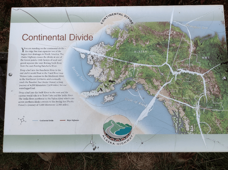 Roadside informational signs enlightened me, this one about the Continental Divide, the watersheds for the Pacific and Atlantic Oceans, and the watershed that flowed into the Artic Ocean to the north (this sign was before reaching Whitehorse). See if you can enlarge it to read the details if you’re interested:
