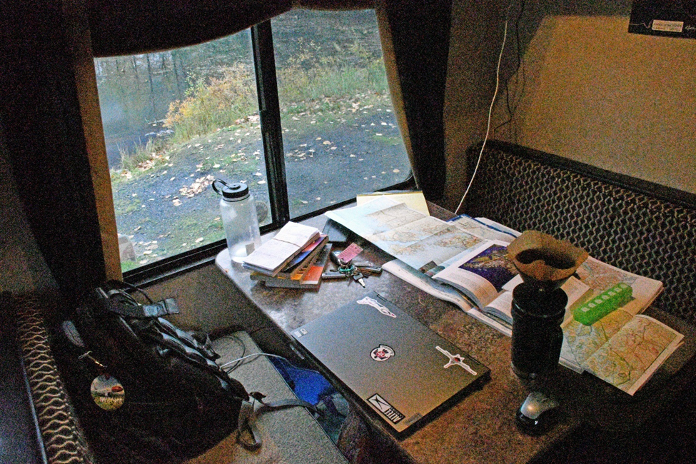 The propane heater works only sometimes – this morning it doesn’t work. And it’s cold! I don’t know how cold, or at least I can’t find out quickly. I had my cell phone turned off, so I had to boot it up to be able to push some buttons and read that it says: “40 degrees.” But where is that temperature taken? Is that from the last place I was within range of a cell phone tower? I just know it’s cold getting out of my sleeping bag, and when I turn on the propane furnace, it’s not working this morning.