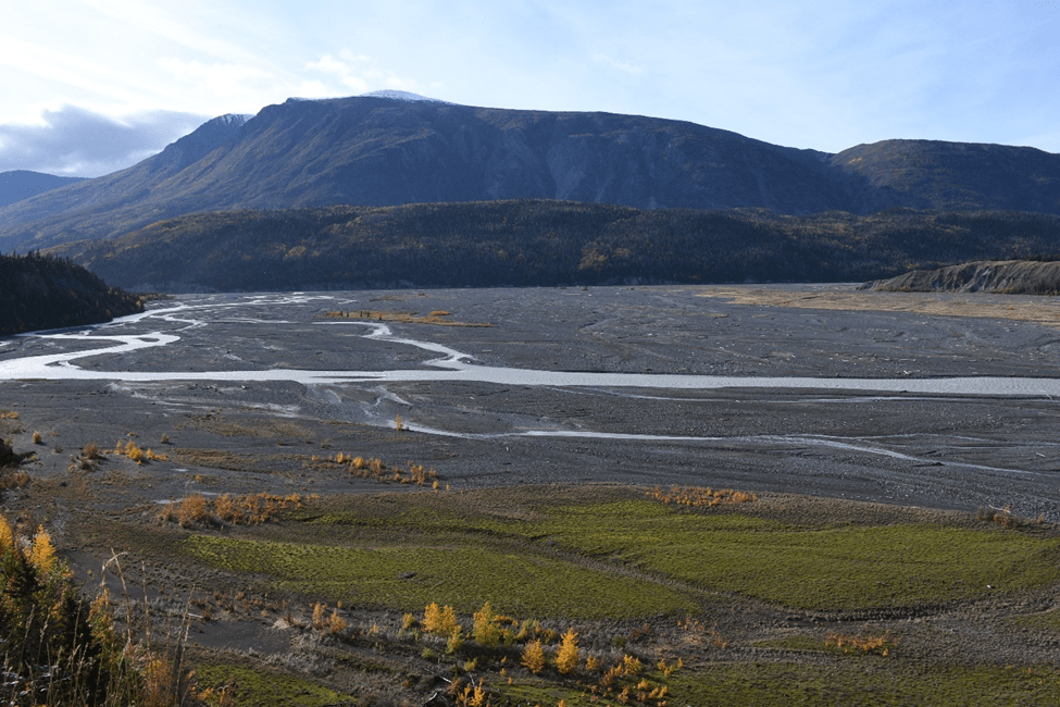 I get information as to why the river beds are so wide and braided while there is just a small shallow stream of milk-colored water meandering back and forth (“ … because of ice blocks coming down during spring break up … keeps the vegetation from growing in the riverbed …”).
