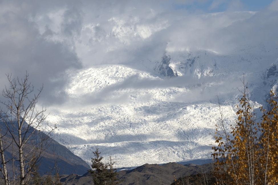 This photo of Kennicott Glacier was taken approximately 5 miles away with telephoto lens from end of McCarthy Road, 60 miles into the park.