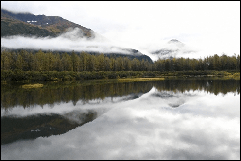 The dirt road I’m on is next to this pond that has passed beyond its summer foliage with the stems of what appears to be lily pads and thick beds of old grasses remaining in the water. I noticed a lot more green vegetation of grasses, bushes, and deciduous trees in the woods here, different from the bright yellow of the higher elevation of Denali.
