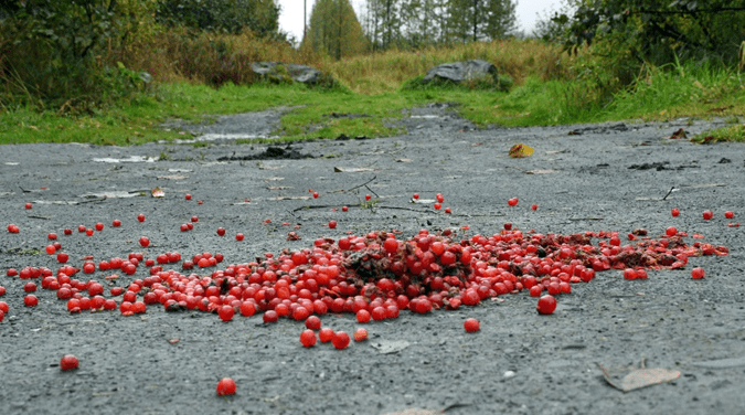 I step away towards the woods and find bear scat – a HUGE pile of it! Reflecting on my memories of the size of a pile of the smaller black bear scat from my neighborhood of Idaho, I consider this pile from local brown bear, a.k.a. Grizzly, as about four times the size – that’s just the brown part of the pile. This guy, whom I name Grizzy Bob, looks like he’s been partying on a bush full of bright red berries, and didn’t bother to digest it. Too much Ripple wine? The diameter of the pile at the furthest berry rolls was about 6 feet across.