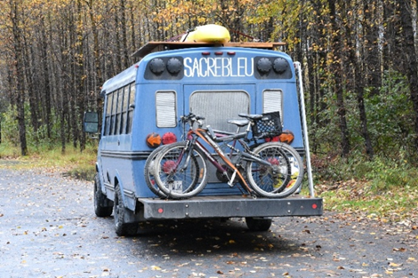 I hiked further down the trail and found other campers. One was a customized bus with the words “Sacrebleu”, a French exclamation often used to express surprise, shock, or mild indignation, according to Google AI (I’m ashamed to say I had to look it up). On top of the bus was a kayak, and bikes were on the back – my kind of people! They got toys!