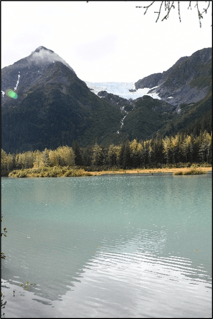 As I step back from the blue-gray water’s edge after “capturing” the glacier in my Nikon to my satisfaction, I ponder the larger ice field above which feeds the glacier from beyond my view. I consider the possibility of a hike up there, at least in my imagination as I know that’s pretty unrealistic.