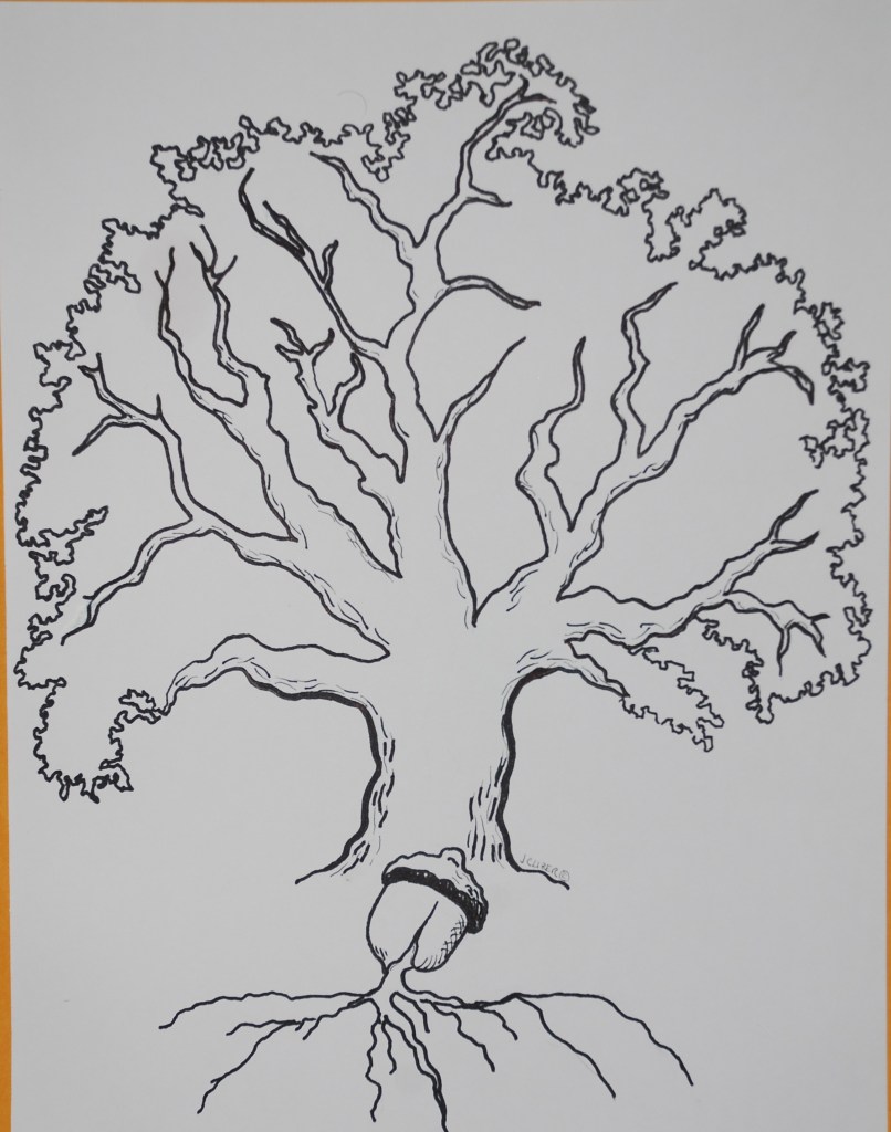 The original oak seed and tree drawing by Jan Clizer represent the fertile seeds of life, the vast potential of each individual living being, each of us different, yet each of us alike enough to call ourselves “kin,” giving us a sense of attachment and belonging. It is perfect in its imperfection, like our own families, like our family of humanity, which make us what we are in this moment in time which is continuously ticking on, like whitewater over the lip of the falls. We can’t stop it!